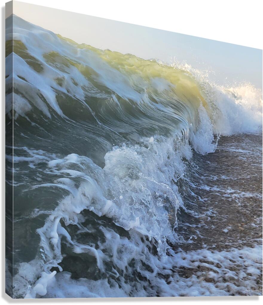 "This unique image shows the outgoing tide below, being overcome by an incoming translucent wave, curling and breaking toward the shore."
